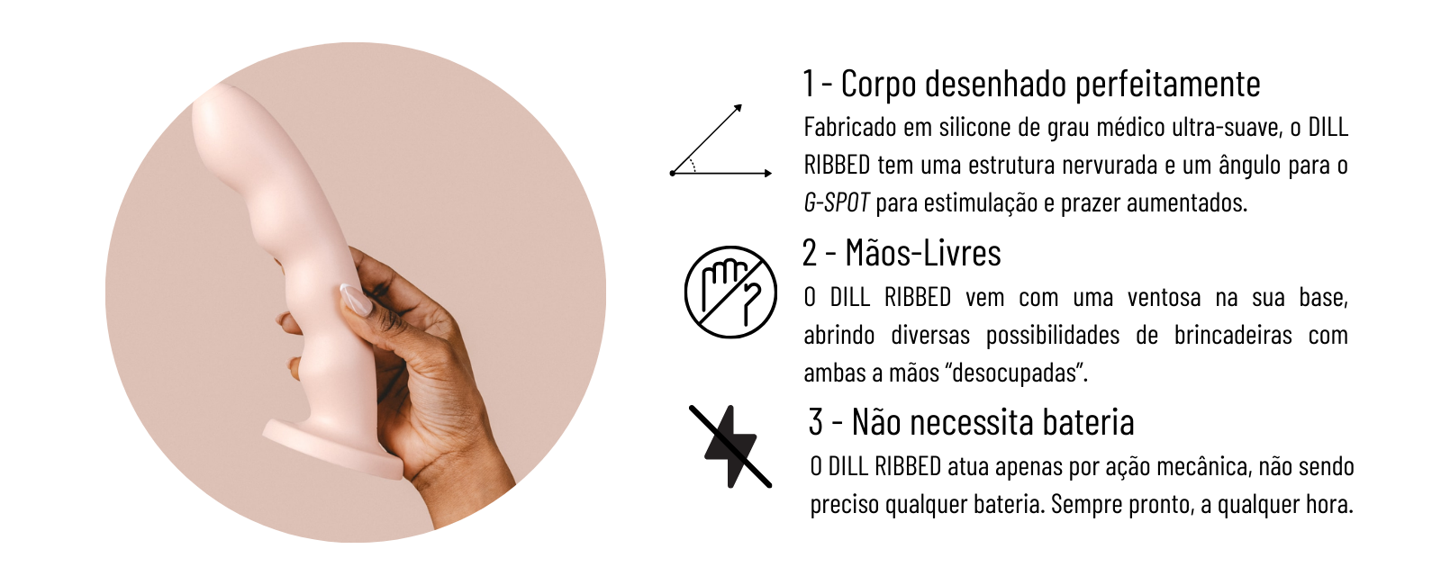 A sua estrutura firme mas flexível adapta-se ao corpo com naturalidade, permitindo penetração vaginal ou anal com máximo conforto. Minimalista, ergonómico e sensual, o Dill Ribbed é a escolha perfeita para quem procura sensações reais, com um toque artístico.