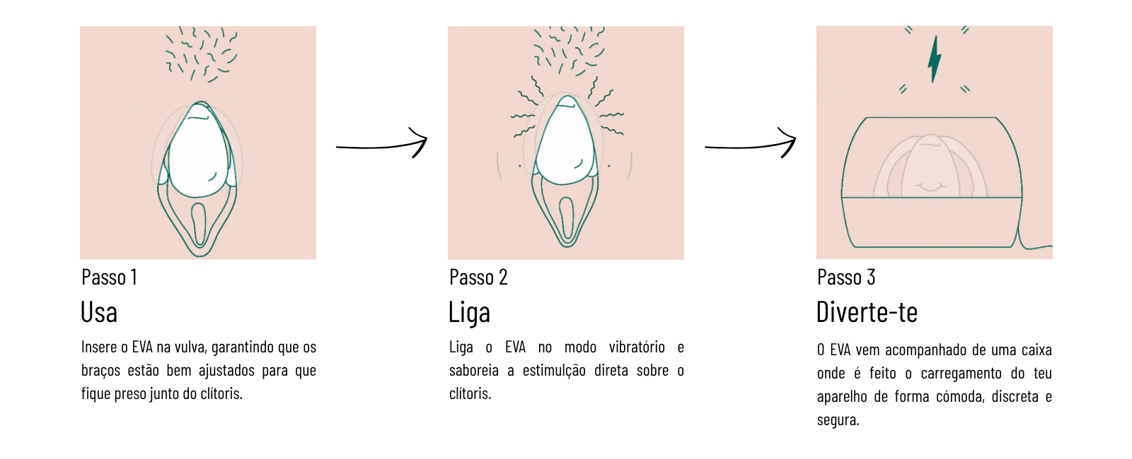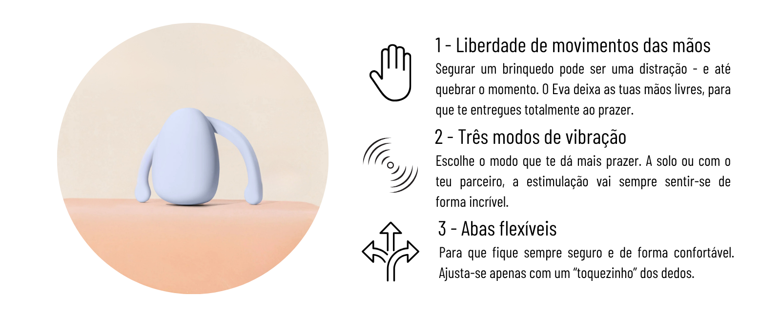Graças às suas alças flexíveis e patenteadas, o Eva encaixa-se suavemente entre os lábios vaginais, mantendo-se no lugar com conforto e discrição. Este design único permite vibrações diretas e constantes no clítoris, sem necessidade de usar as mãos, mesmo durante o sexo com penetração.