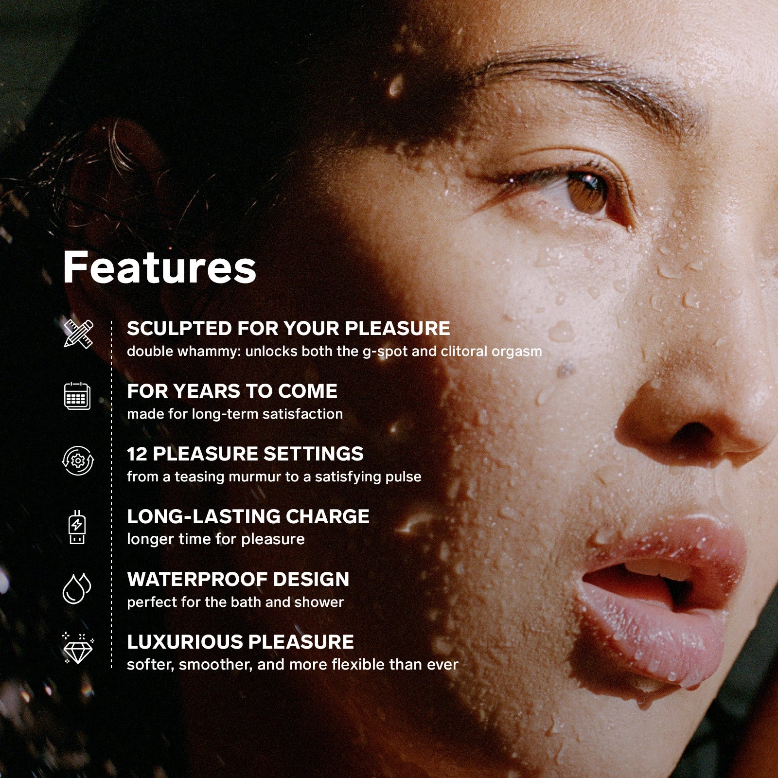 Após o uso, limpa com água morna e um sabonete neutro ou um spray próprio para brinquedos. Seca suavemente e guarda na bolsa de cetim incluída – porque o luxo também está nos detalhes.