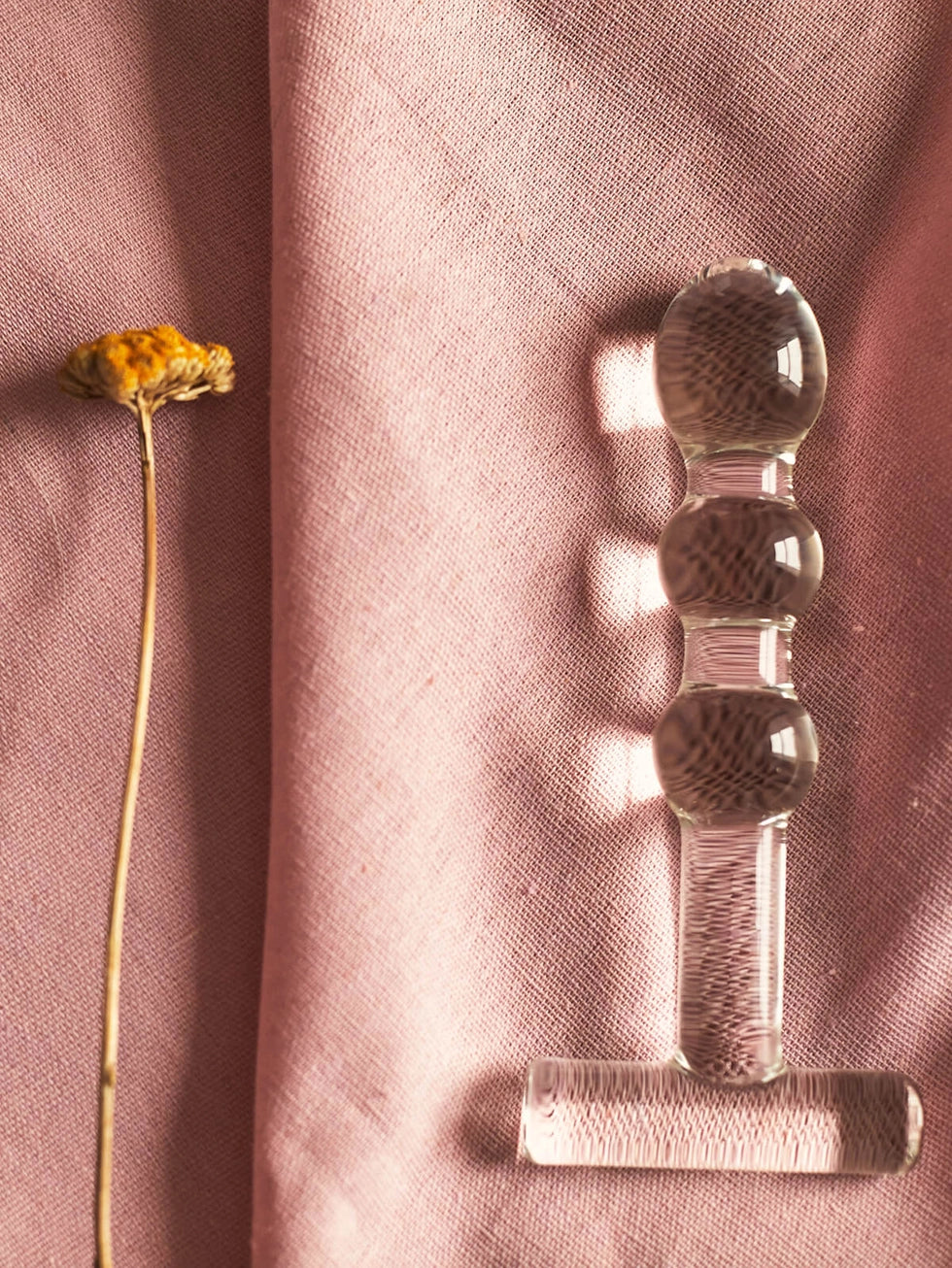 Introduz o dildo em vidro lentamente, explorando a estimulação proporcionada pelas suas estrias.