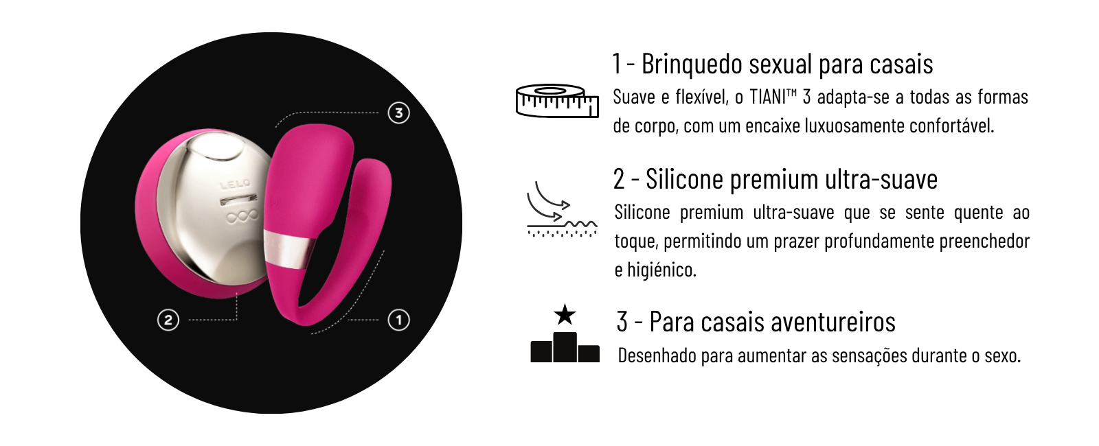 O Tiani™ 3 é um vibrador de casais com comando remoto, concebido para ser usado durante o sexo - proporcionando uma experiência íntima em que cada movimento se transforma numa dança de prazer partilhado.