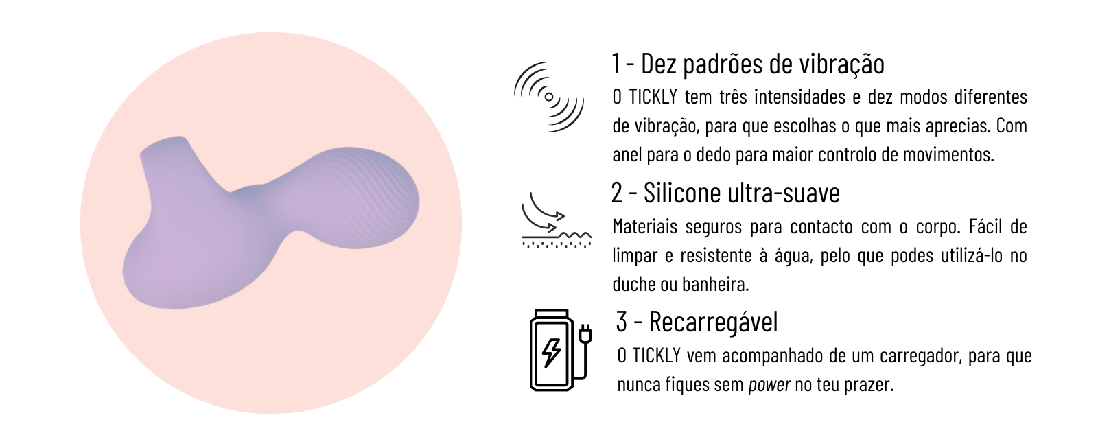 E porque o prazer não deve ter limites, o Tickly é 100% à prova de água - ideal para aventuras sensuais no duche ou banheira.