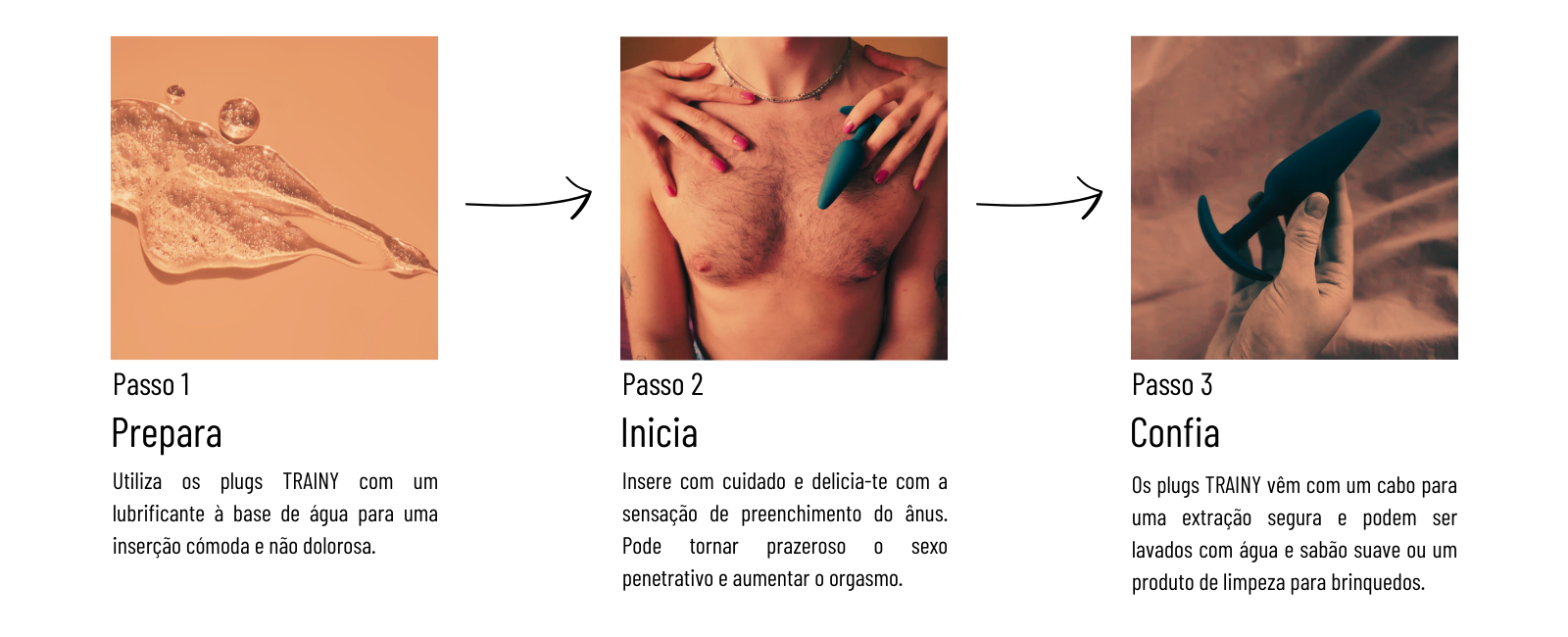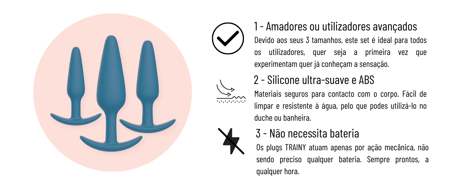 O Peech Trainy™ é um conjunto de três plugues anais desenhado para acompanhar uma jornada gradual de descoberta — desde os toques iniciais até à exploração mais íntima. Fabricado em silicone de grau médico, isento de látex e ftalatos, este set foi criado para quem valoriza conforto, discrição e bem-estar em cada fase do prazer anal.